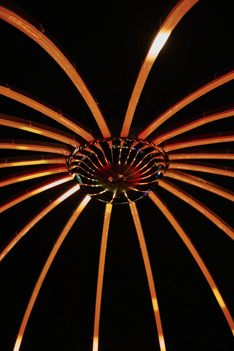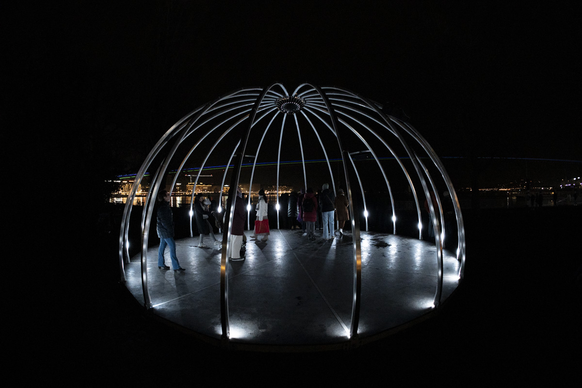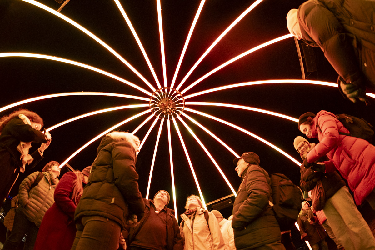 Polaris is a new star that has appeared on Earth. In the form of a luminous dome, the installation deploys a circular architecture of arches converging towards an incandescent center. This solar core attracts and draws in the public, inviting them to come closer, to be absorbed within the star's very essence. Audiovisual sequences based on Euclidean structures punctuate the whole, charting a voyage from the frigidity of space to the vibrant warmth of the star's heart.